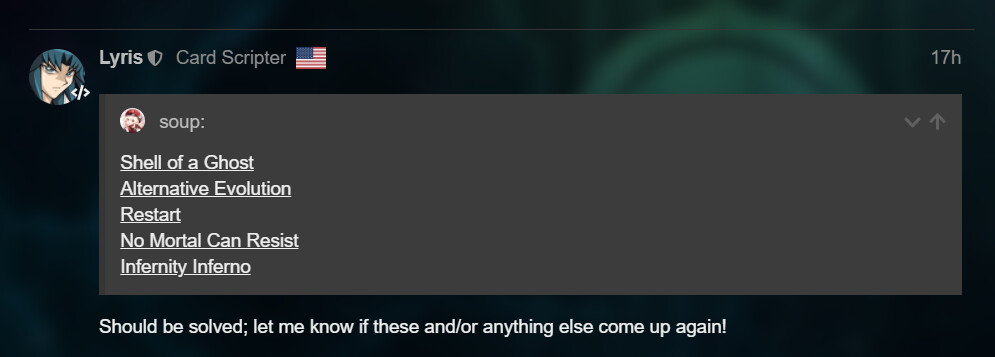 The guy above from the previous thread said it was fixed but I just recently played and you still can’t resummon the alt evo’d alternative. Maybe it still thinks its a vanilla blue eyes or something I do hope this gets fixed soon thank you very much.