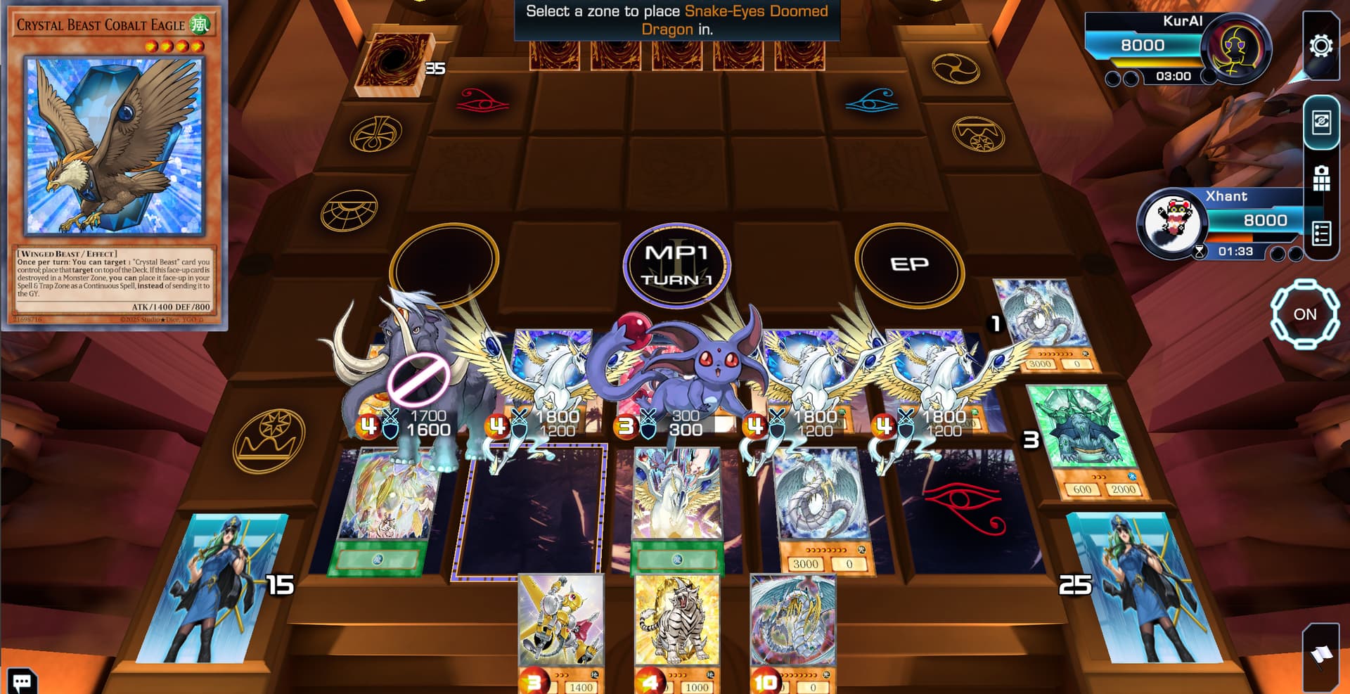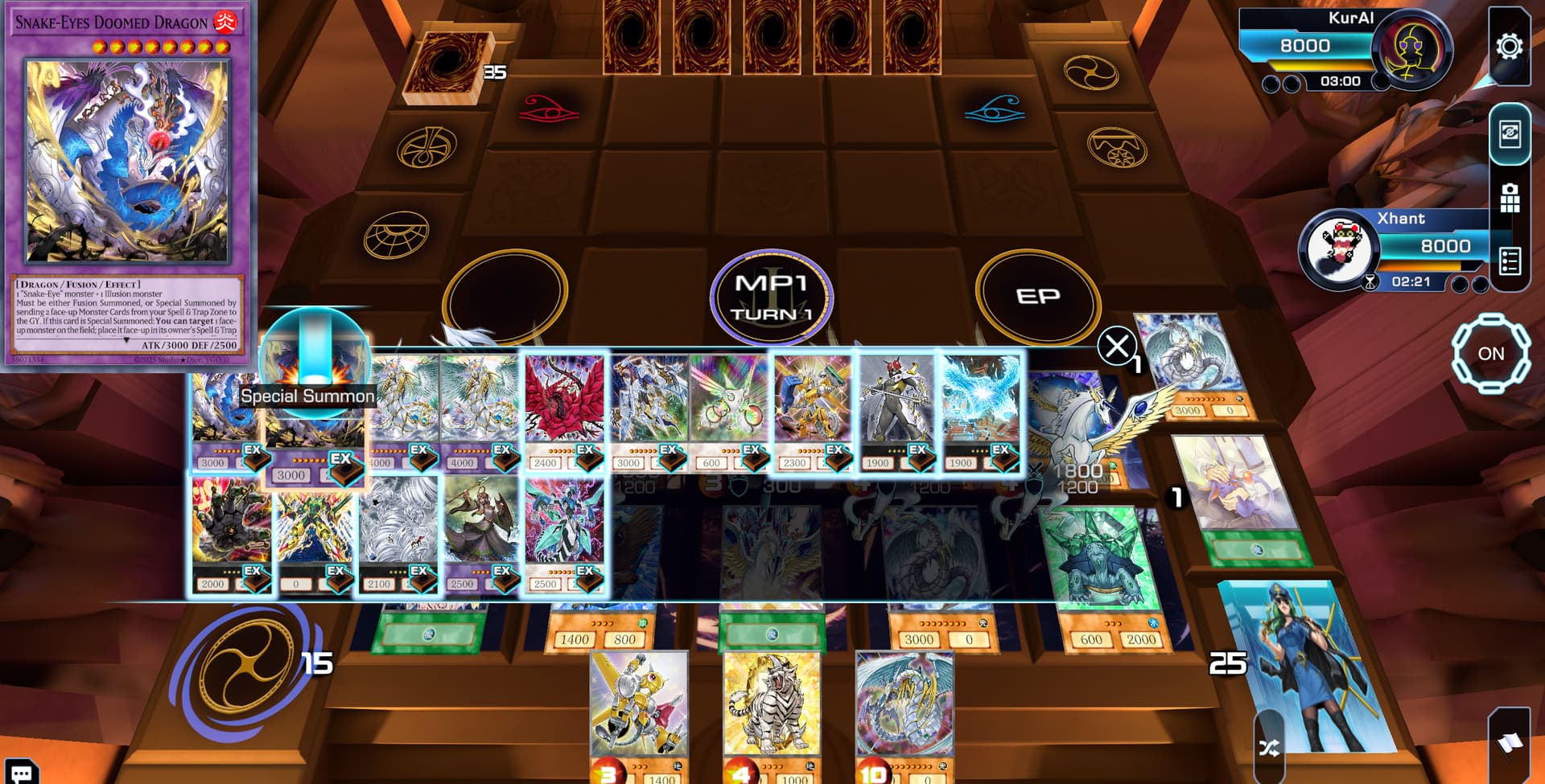 When playing in the genesys preset (specifically, with the extra game rule “Show Extra Monster Zone” deactivated), if your 5 monster zones are full, and you have 2 monsters in the spell / trap zone, you can begin to summon Snake-Eyes Doomed Dragon, but because you don’t a zone to summon it to (the EMZ doesn’t exist in Genesys mode), you can’t finish the summon and you’re soft locked.
