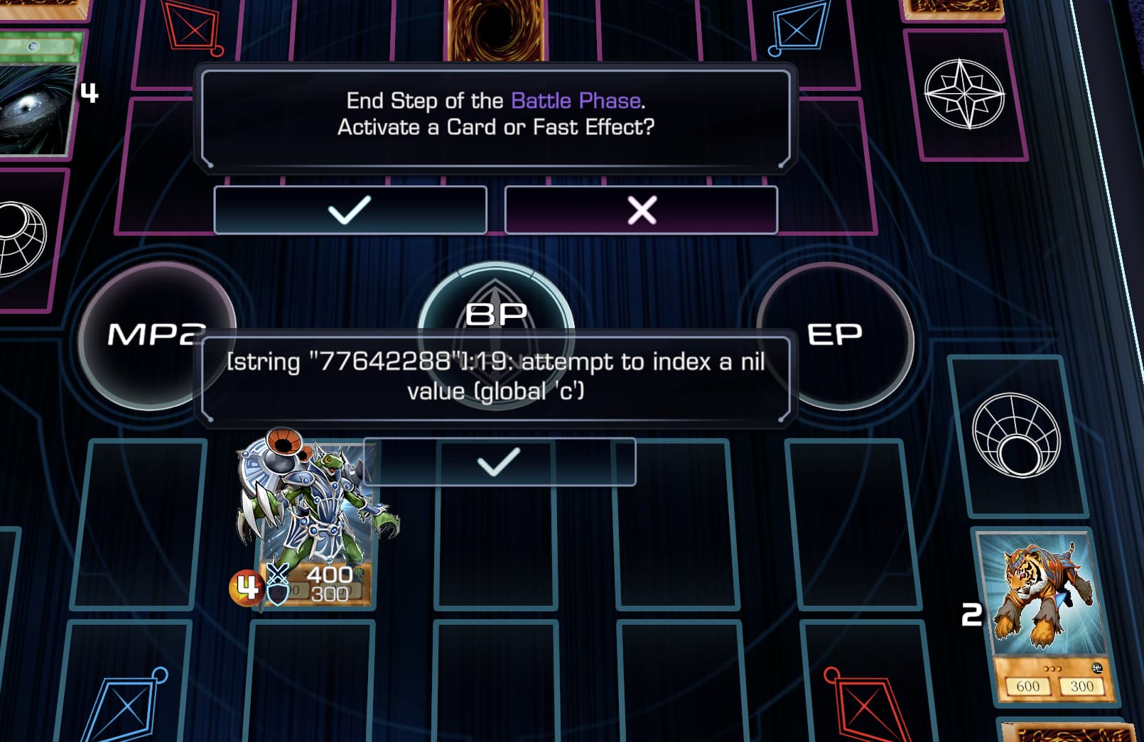 Replication steps: summon any gladiator beast> summon test tiger> activate test tiger> summon secutor from deck> secutor attacks successfully> proceed to end of battle phase. Error appears at this moment.