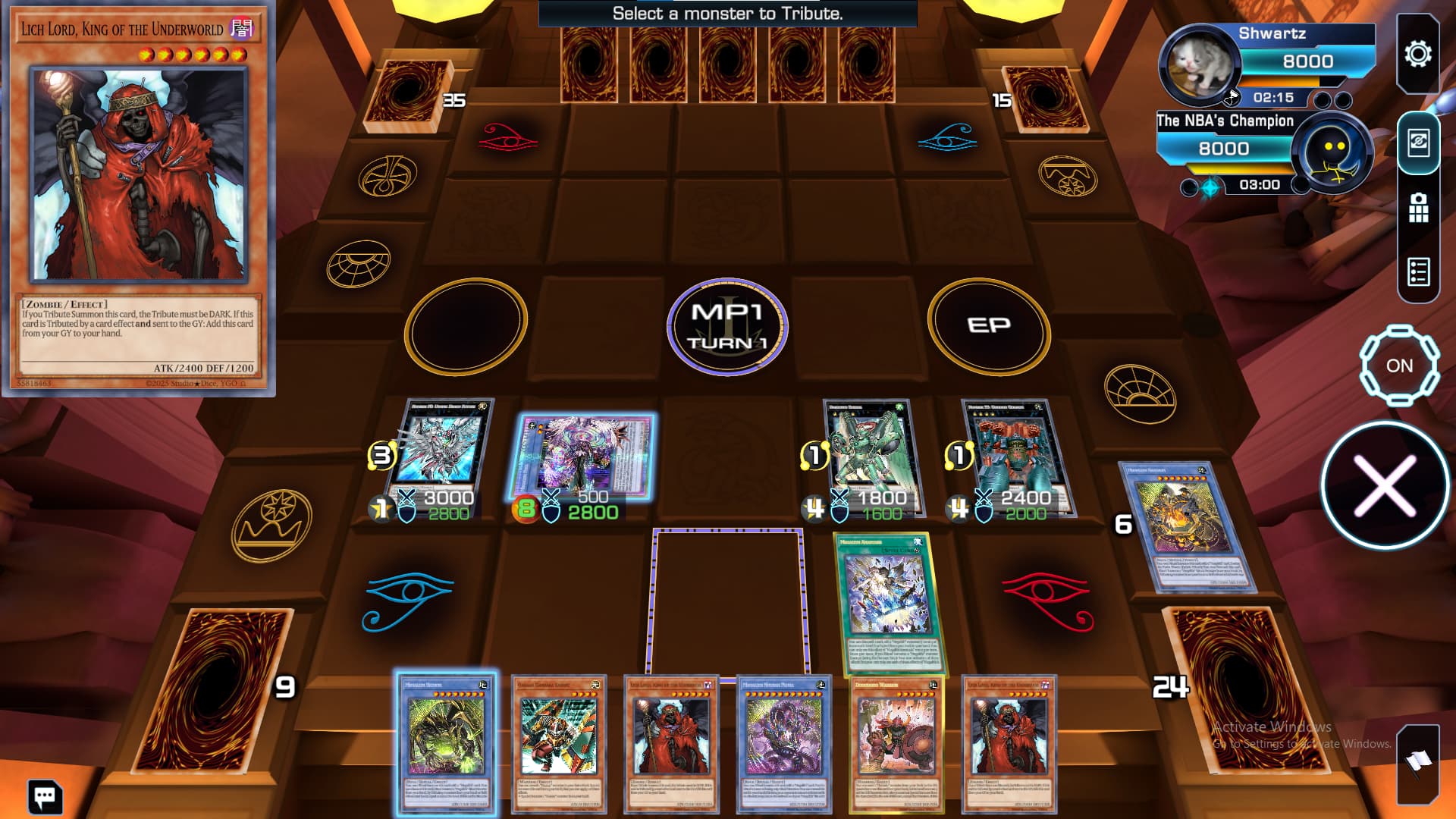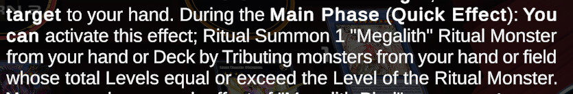 In multiple different instances when attempting to ritual summon using Megalith monsters, I am not being allowed to use other non-megalith monsters as tributes for the summon. This is not a lock placed on me from any of the cards or effects, and only happens sometimes. I will post a replay code after this post that has multiple instances of not being able to use Lich Lord, King of the Underworld as material for the ritual summon. I believe he should be able to be used in almost every situation except for use with Megalith Unformed.